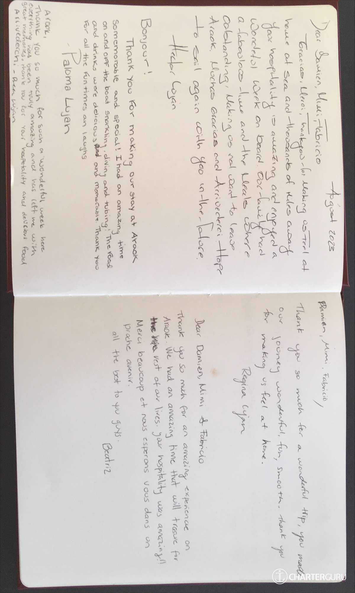 Bonjour! Thank you for making our stay on ARAOK so memorable and special! I had an amazing time on and off board – snorkelling, diving, and tubing! The food and drinks were delicious and memorable. Thank you for all the fun times and laughs.