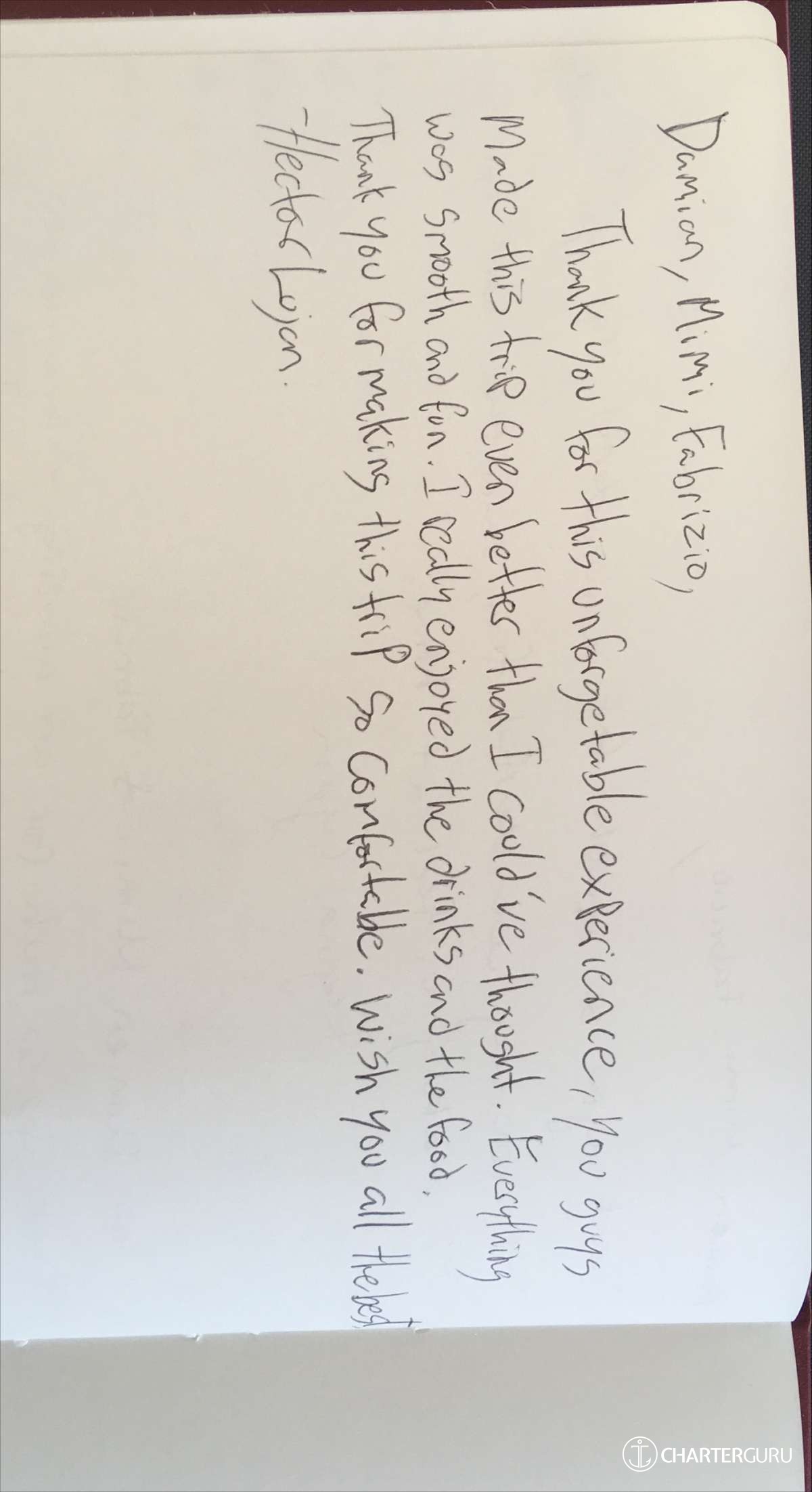 I have spoken with him by phone. He told me that he had a great time on board, and he enjoyed a lot. He liked the boat, and he liked a lot the crew. He told me that the skipper was great. Best regards"