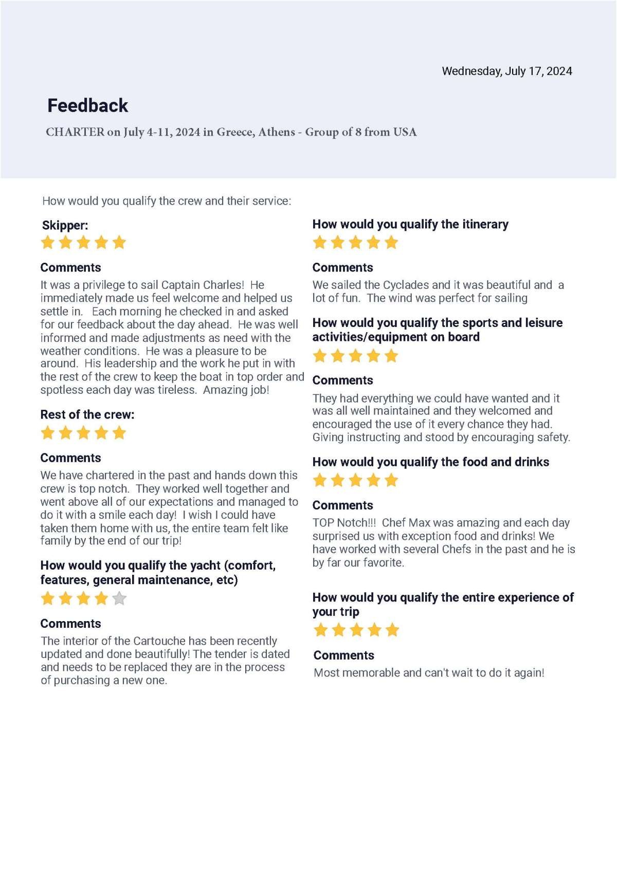 "I heard from C. yesterday, and she expressed that they had the most phenomenal time onboard Cartouche and that you and your crew were beyond exceptional.