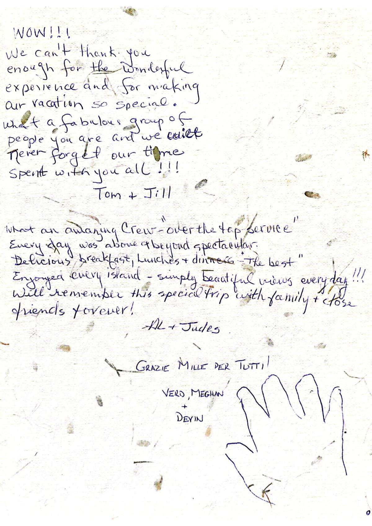 Delicious breakfasts, lunches, dinners "the best" Enjoyed every island - simply beautiful views evry day!!! Will remember this special trip with family + close friends forever! A & J GRAZIE MILLE PER TUTII ! V, M & D