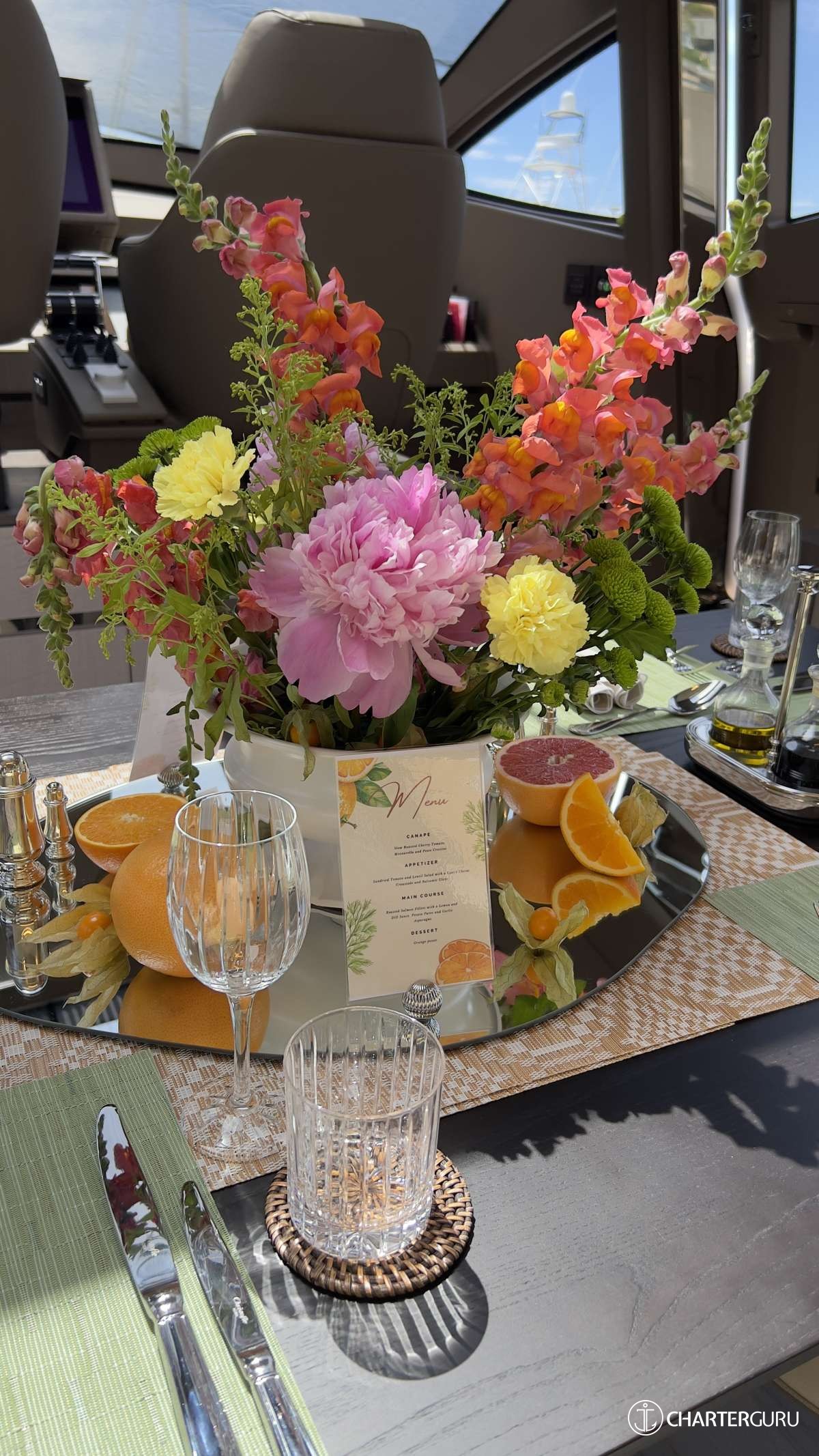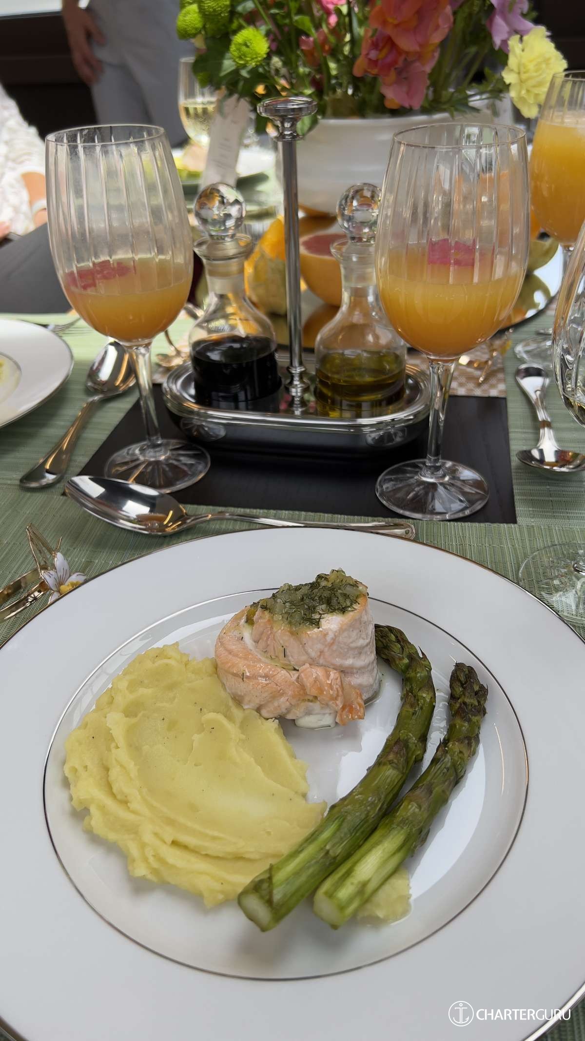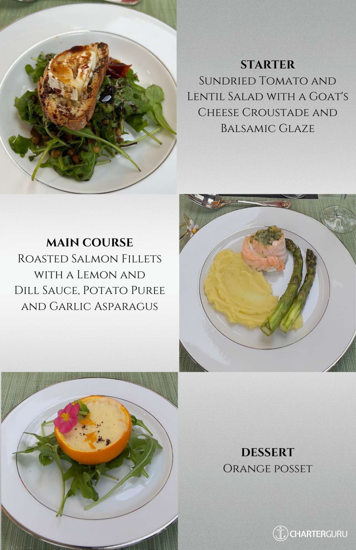 Overall ambiance and atmosphere: Just perfect. Presented like a yacht chef food is expected to look like. 5* presentation. Only comment is about rocket salad being served with dessert which I thought was an odd pairing. I thought the canape was delicious, fresh, tasty; the starter was a good combination with the goats cheese and lentils - a classic pairing; the salmon was cooked perfectly and I loved the swirl. Grilled asparagus, always a win. The orange posset was a first for me. I'm a convert!