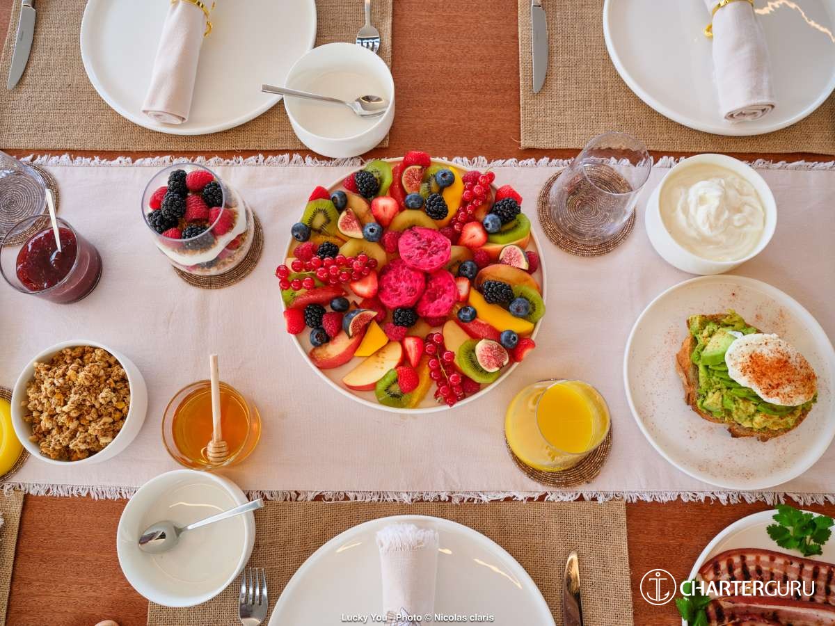 Lagoon Sixty5 2025 is introduced primarily as a sailing catamaran. The the heart of the yacht is the main saloon, which connects to the aft deck. The aft deck is where heart of the yacht is and that's where most of the meals are served. The tastefully decorated cabins are connected by stairs to the main saloon - roomy, comfortable and pleasant. The cabins are located in the 2 massive hulls. Multiple portholes provide a connection with the natural world outside.