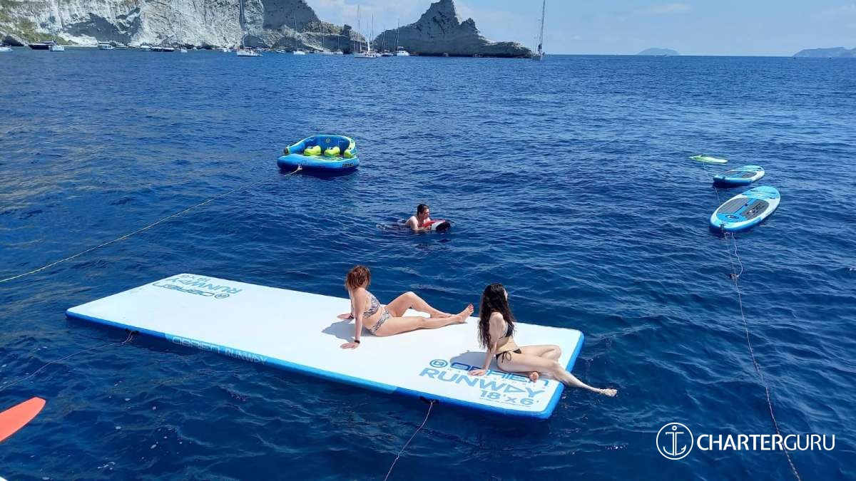 • Water sports on board: snorkeling gear, kayak, fishing rod, underwater scooters, SCUBA, SUP, E-Foil