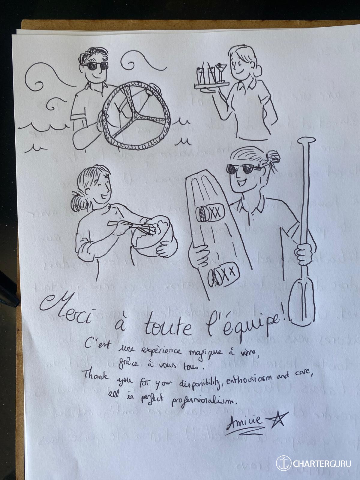 - What a vacation!! unforgettable... and what a boat! a real marvel... a real little jewel. A big bravo to the whole crew, who were always there for us, always on deck! They had a lot of courage with us, and above all, patience! a special mention to Roger, who delighted us all day long, locked away in his kitchen. What an excellent idea to have chosen an Italian chef...