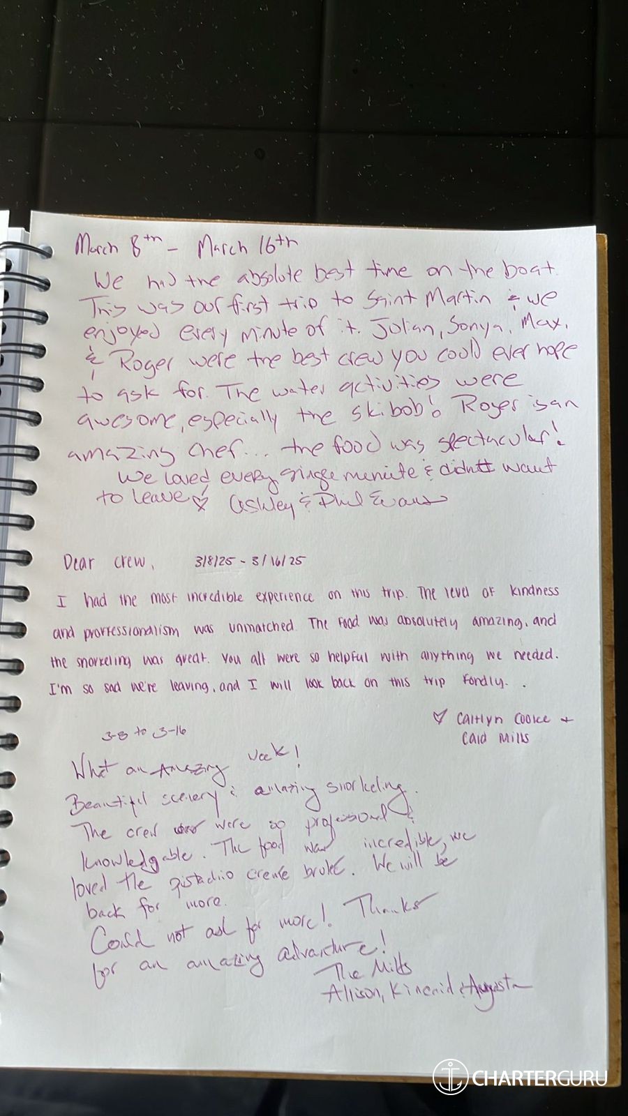 - Unforgettable vacations aboard the boat! A big thank you to all the crew for making this vacation so special by being so attentive every day. Thanks to Roger for his delicious meals! See you soon!