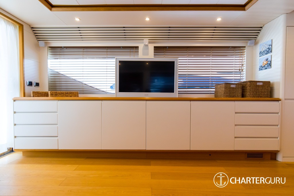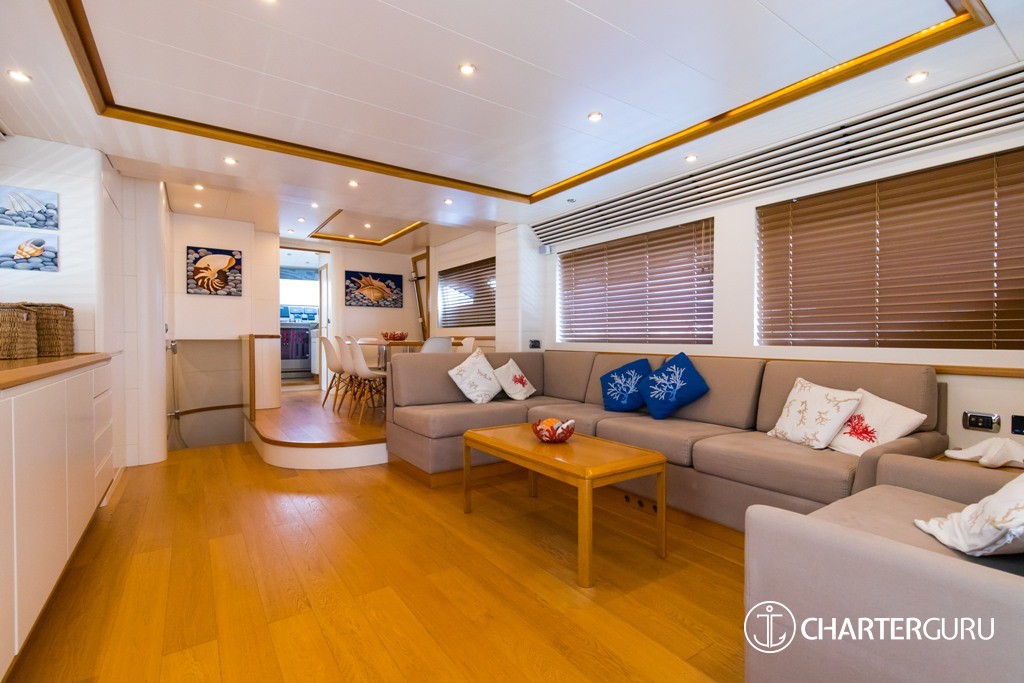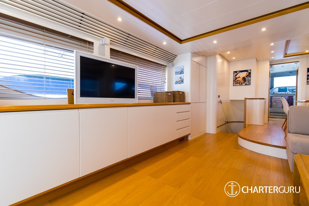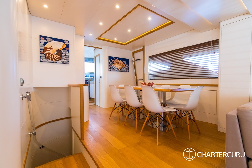 On the main deck, a beautiful salon offers ample space to relax on two sofas and a separate formal dining area. On the foredeck a spacious and perfectly equipped galley allows our chef on board to cook delicious meals and the bridge deck also include a sofa with a coffee table to enjoy the navigation.