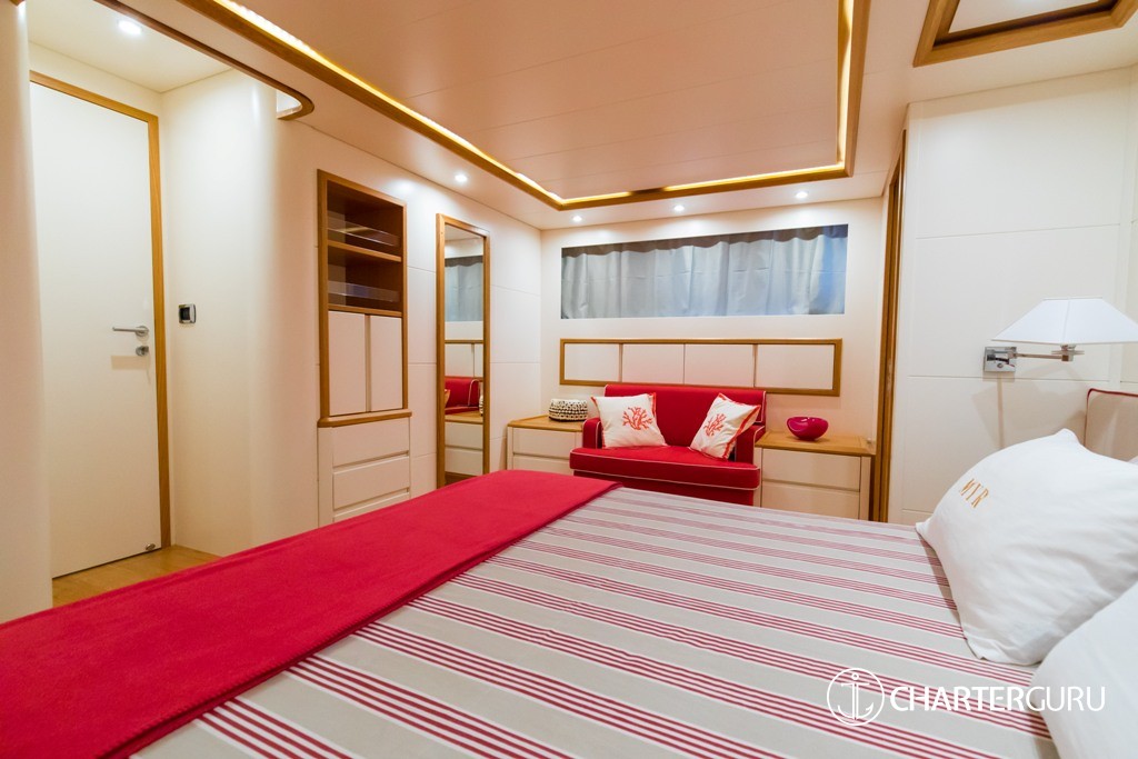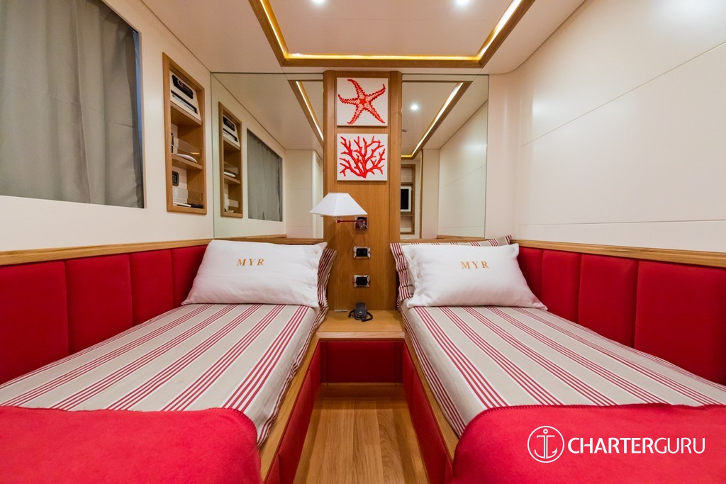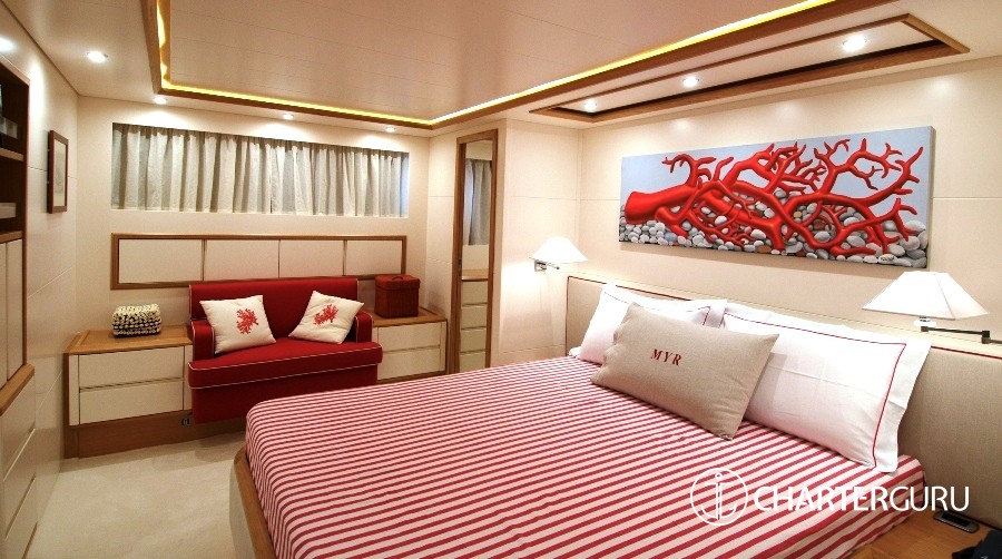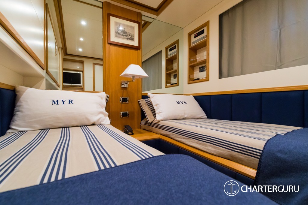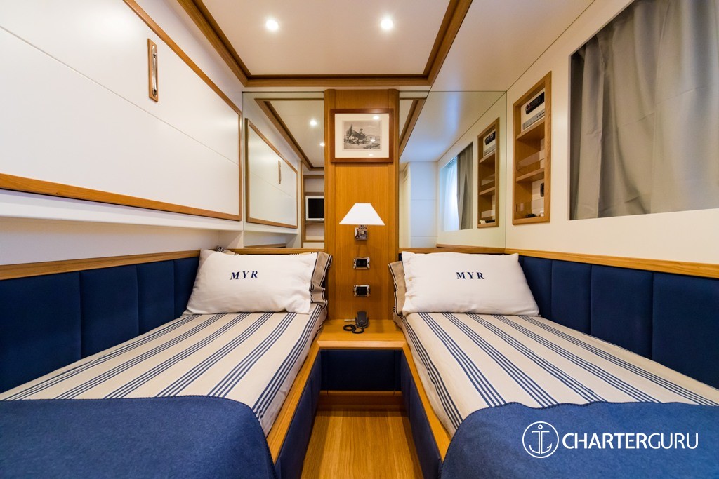 Modern, fast and luxurious, Riviera offers accommodation for up to 9 guests in four wonderful cabins located on the lower deck. Both the master and the VIP suite are full-beam, this means they're very spacious, light and airy. One of the two twin cabins offers an additional Pullman bed; All cabins have en-suite facilities and flat screen TV.