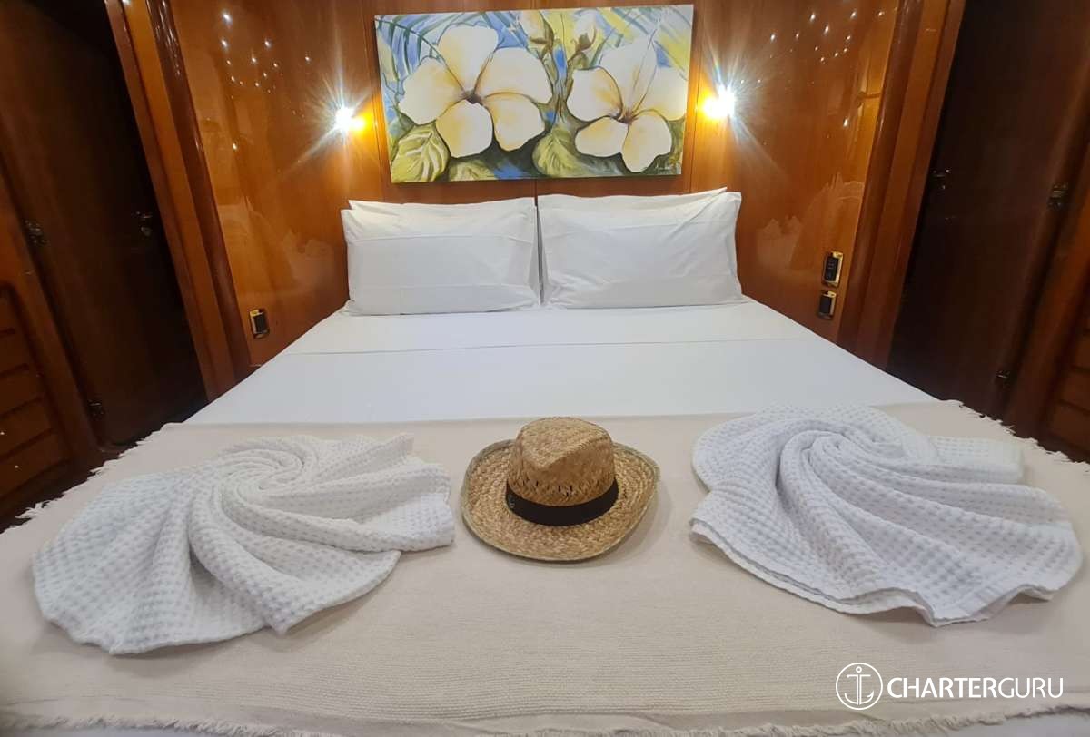 The lower deck houses the sleeping area divided into: a master cabin with a large double bathroom; a VIP suite with private bathroom; one double cabin with separate beds, all cabins are equipped with ensuite facilities. An additional fourth cabin with pullman beds is available upon request or for special occasions.