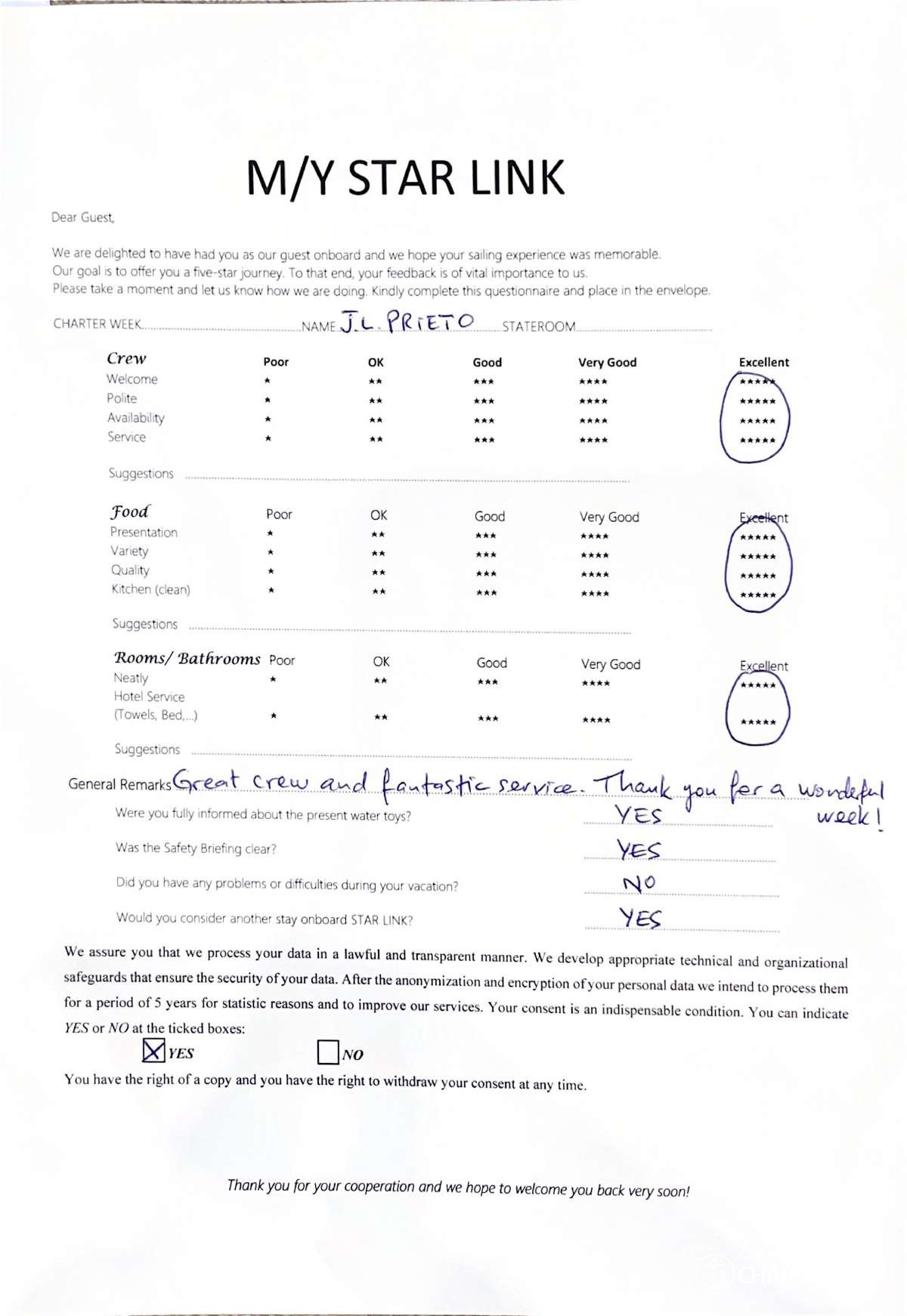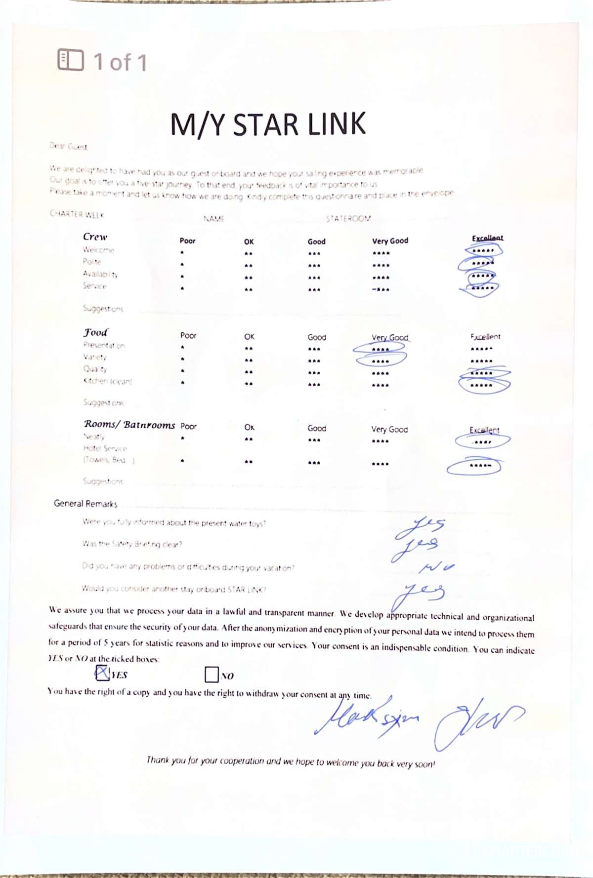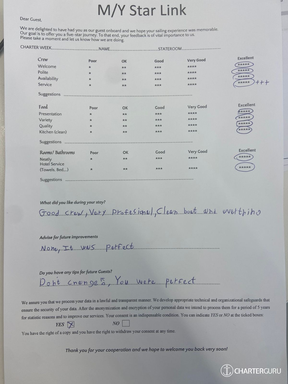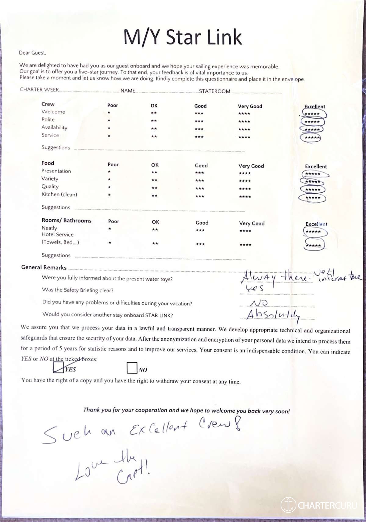 For a motor yacht like STAR LINK, the expected APA is 25% to 40% of the charter price (€10,000 - €16,000), making the charter cost €50,000 to €56,000. Exact amount will be confirmed after inquiry.