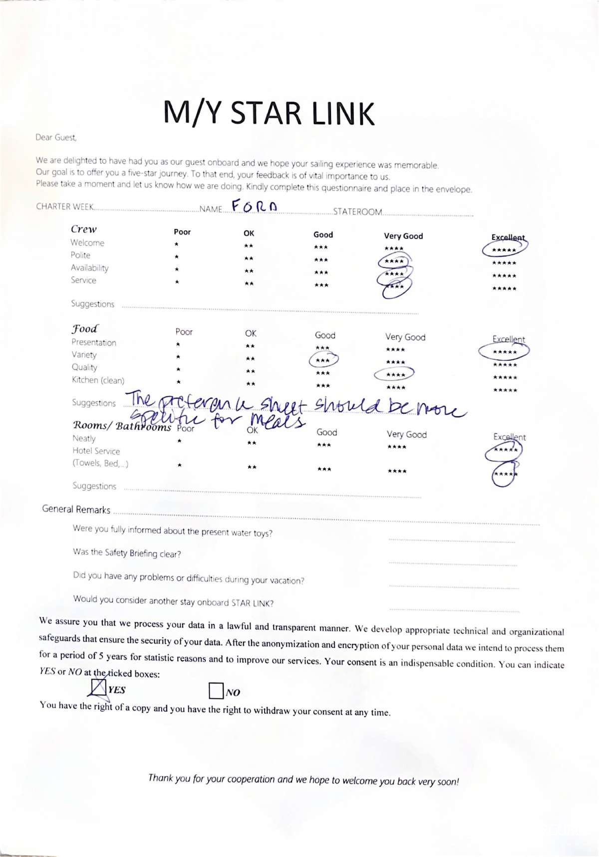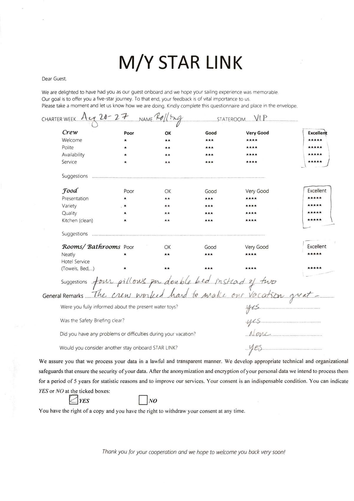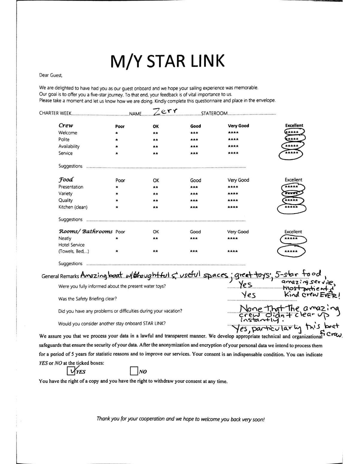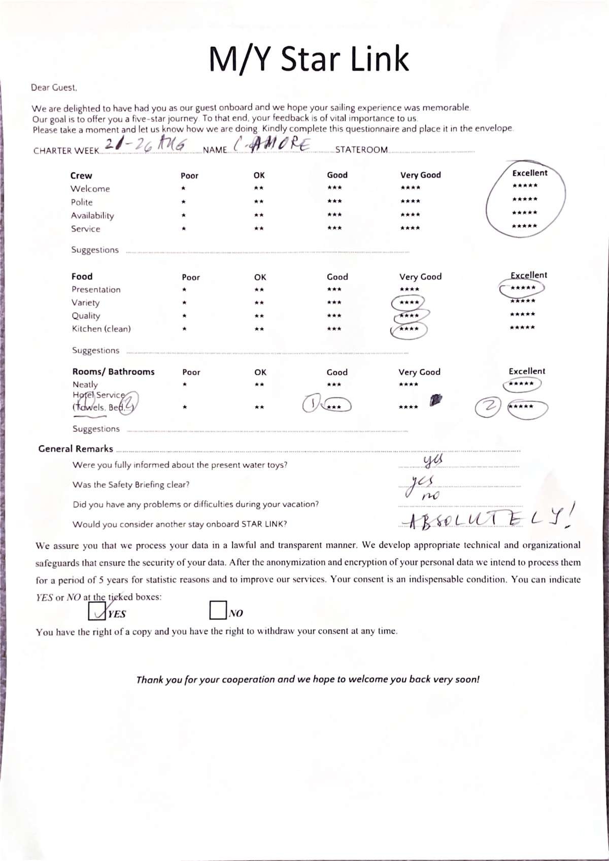 For a motor yacht like STAR LINK, the expected APA is 25% to 40% of the charter price (€10,000 - €16,000), making the charter cost €50,000 to €56,000. Exact amount will be confirmed after inquiry.