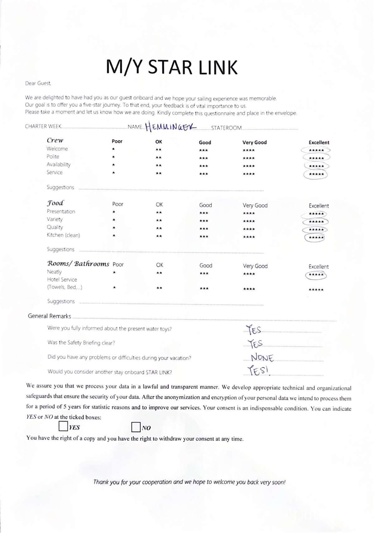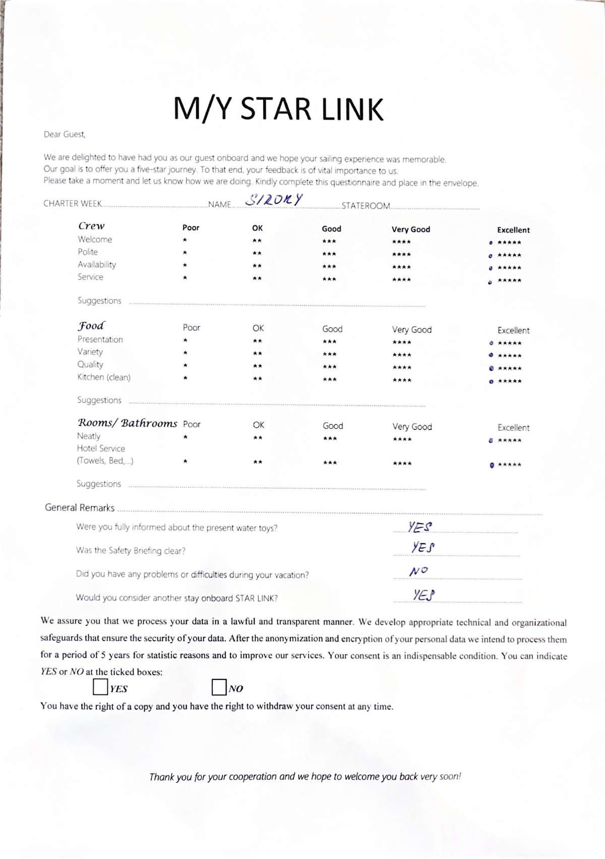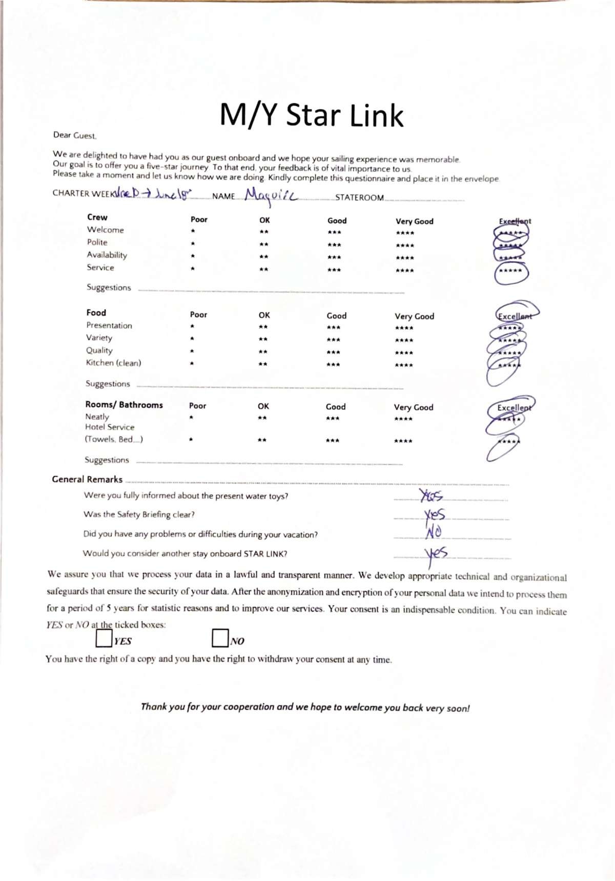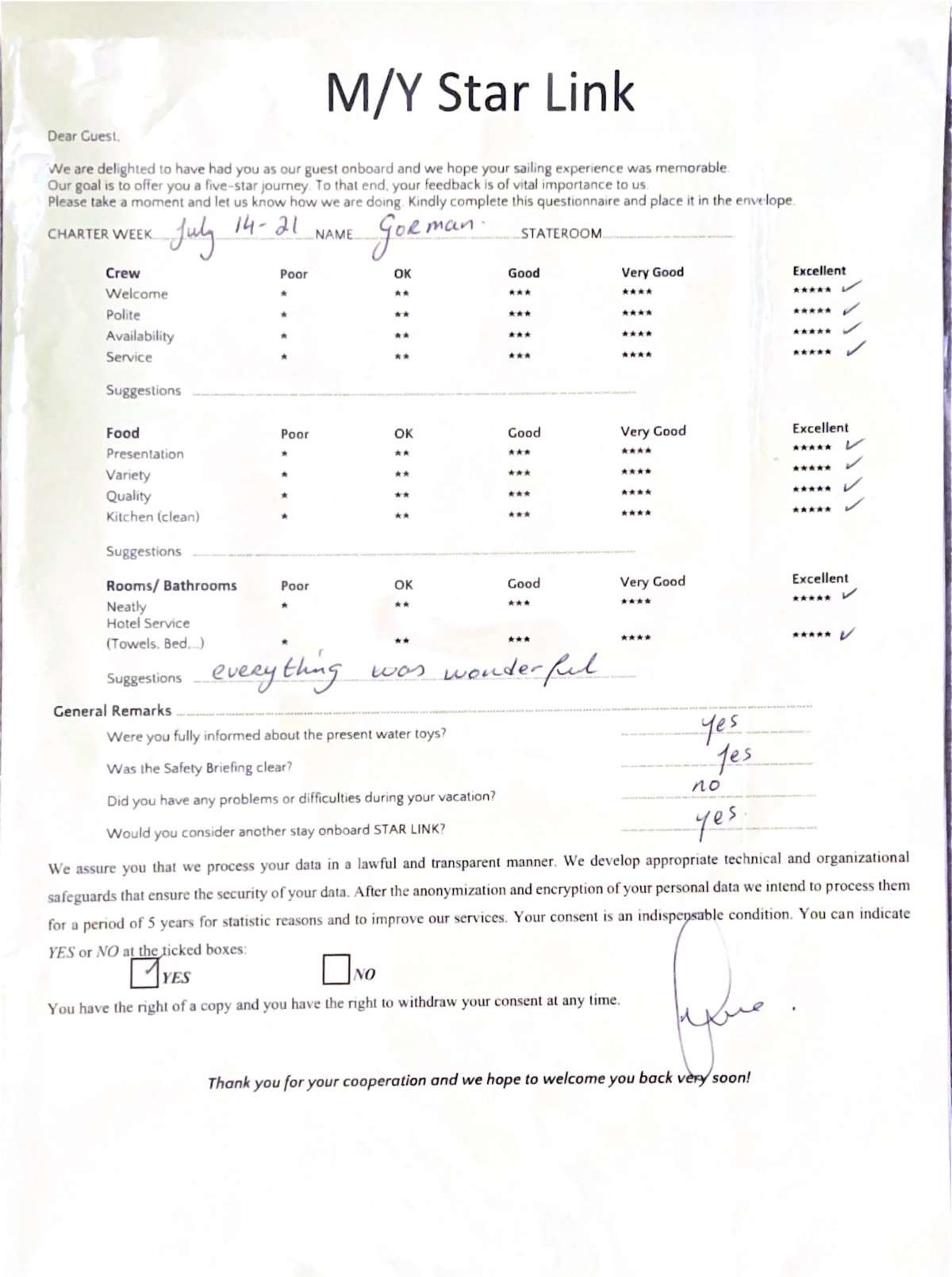 For a motor yacht like STAR LINK, the expected APA is 25% to 40% of the charter price (€10,000 - €16,000), making the charter cost €50,000 to €56,000. Exact amount will be confirmed after inquiry.